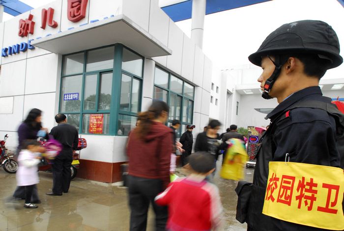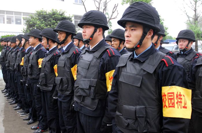 2010年5月5日早晨6時許,全副武裝的校園特衛(wèi)人員整裝待發(fā)。自當(dāng)日起,江蘇省淮安市首批46名配備鋼盔、防刺服、防割手套、防暴膠棒、滅火槍、催淚器等防護(hù)裝備的專職校園特衛(wèi)人員開始進(jìn)駐市直23所中小學(xué)和幼兒園,守護(hù)校園平安。這些人員都是從全市保安隊(duì)伍中精選出來的骨干,年齡在35歲以下,大都有部隊(duì)服役的經(jīng)歷,身體素質(zhì)和政治素質(zhì)較好,且受過專業(yè)訓(xùn)練。